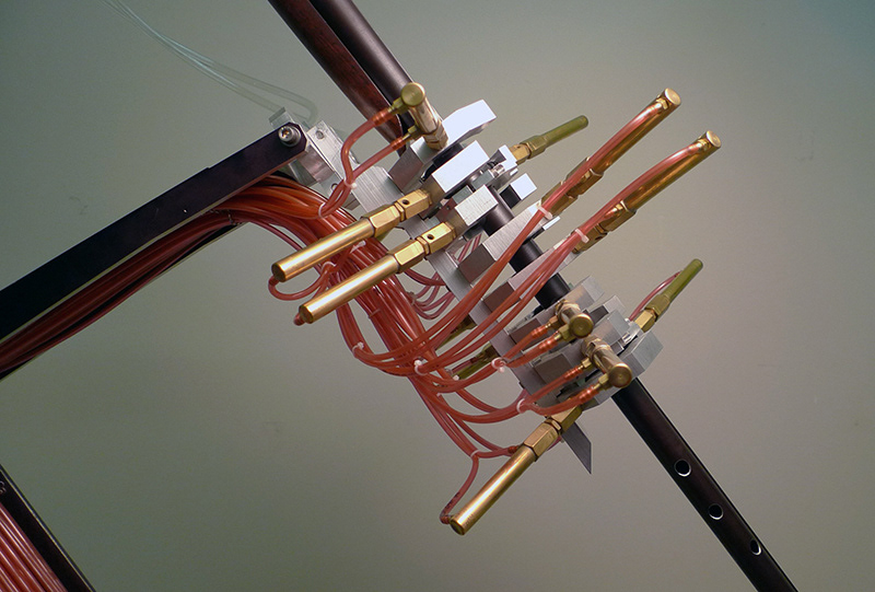 Chifte Kavali (Double Barrel Flute) is a mechano-robotic flute built out of a disabled shotgun and industrial components. The gun barrels have been transformed into a double-flute, which is played by compressed air. The mechanics are programmed and controlled through the use of open-source electronics using an Arduino microprocessor.