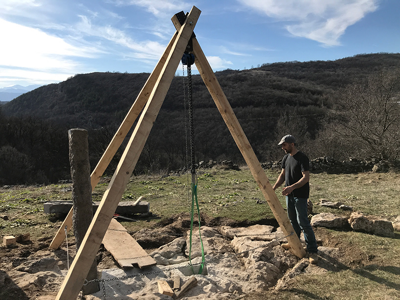 The stones arranged in the intended composition, in preparation for shaping the column bases and lintel joints.