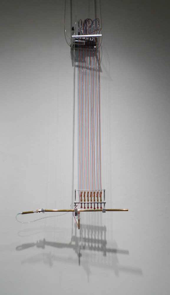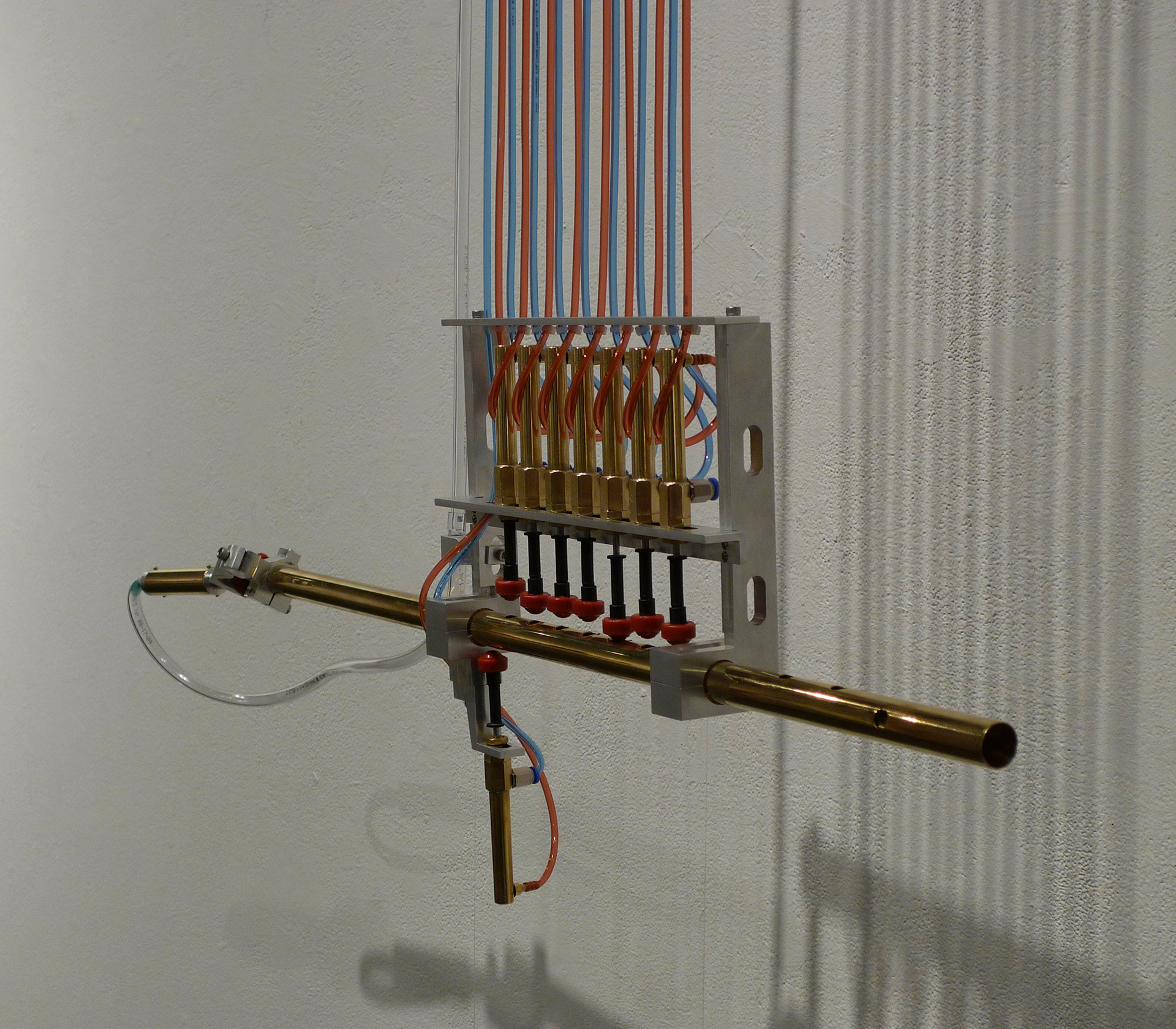 This installation functions as an interactive artwork. To hear it play, one needs to toss a coin into the musician’s hat. The sound and mechanical movement is produced by air supplied from a compressor and each song consumes about 100 liters of air. A commentary on the relentless commodification of natural resources, this artwork sells air in the shape of songs.