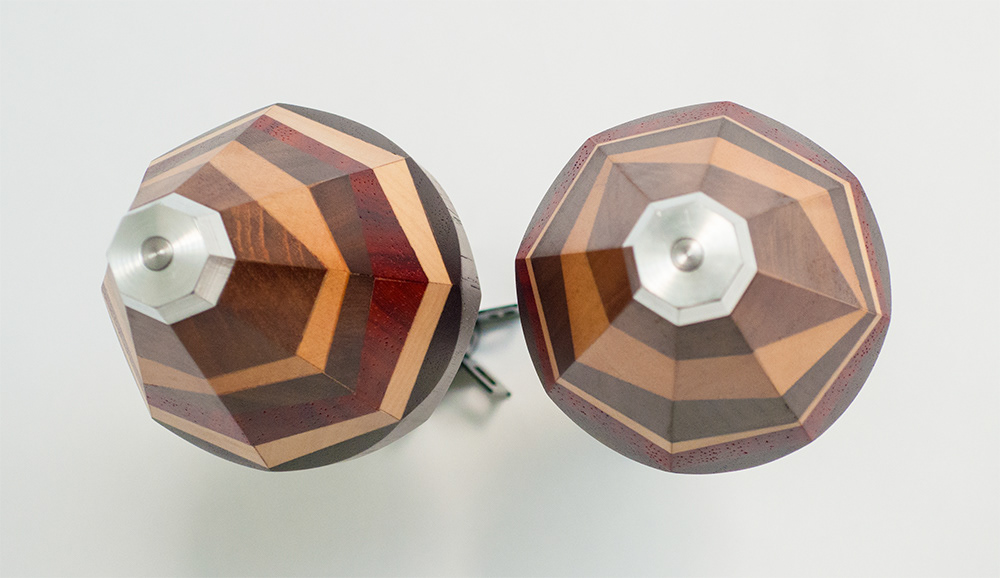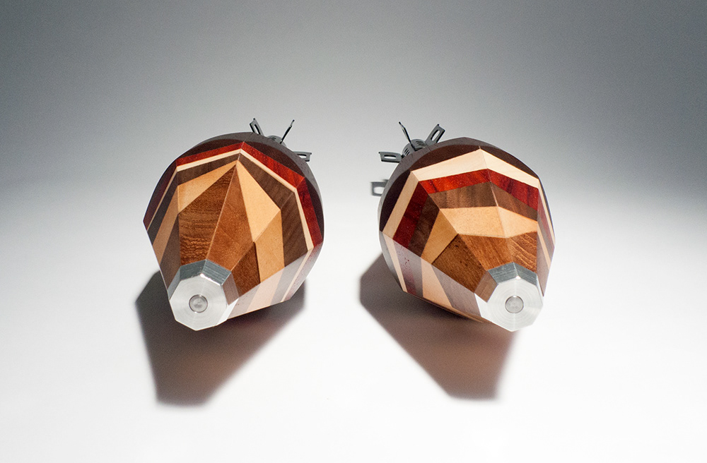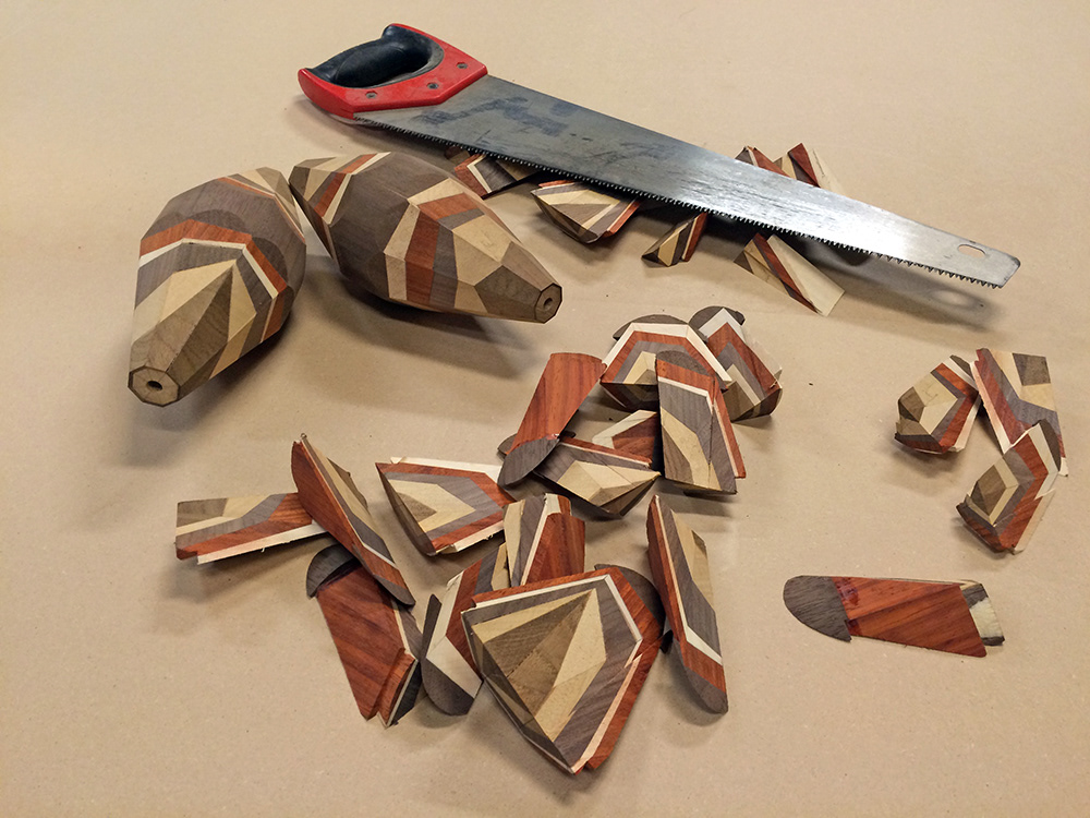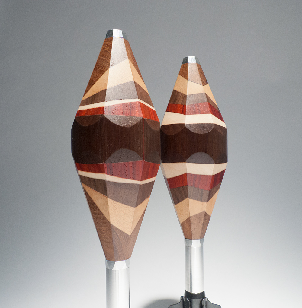 In order to depict the data most precisely, the ‘murrine’ for this sculpture were composed of glued strips of different color hardwoods, cut and laminated together in an exact pattern, one layer at a time. The ends of the wooden ‘murrine’ were then tapered in order to reveal the inner layers, in a manner similar to the original glass beads technique.