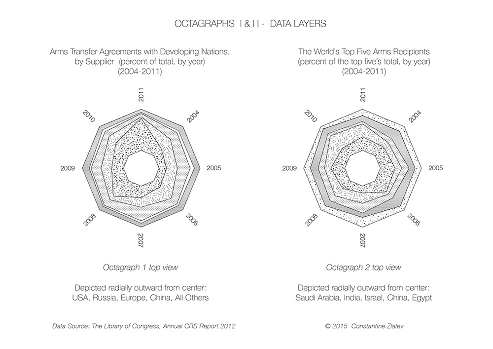 Octagraph I: Depicts eight years of arms exports to developing nations by the top 5 global suppliers.